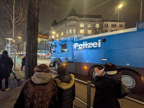 „W poniedziałek wieczorem demonstracja przeciwko Światowemu Forum Ekonomicznemu przybrała gwałtowny charakter, powodując zniszczenia mienia i starcia z policją. Jak poinformowała policja miejska w Zurychu, w wiecu zorganizowanym na początku Światowego Forum Ekonomicznego wzięło udział kilka tysięcy osób.” Całkiem przypadkiem na miejscu byli przedstawiciele Tygodnika, więc macie kilka zdjęć protestów. [Swiss Info]
